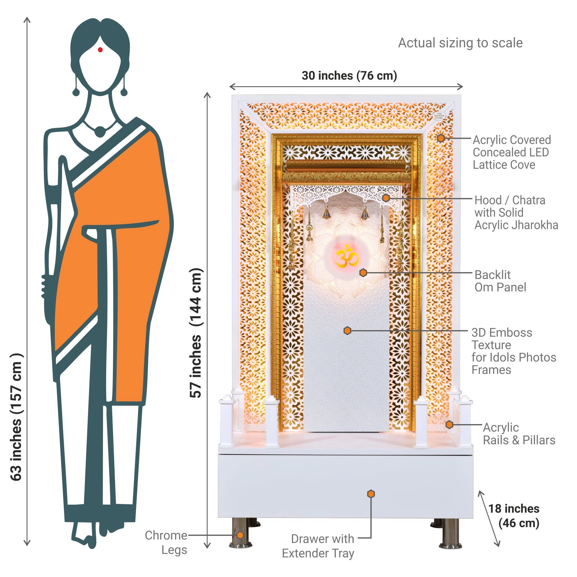 Designer modern mandir crafted for your divine worship. The name “Vivaan” means full of life and that’s how you will feel when you bring this mandir to your home or office space. This mandir is ideal for a pooja room where you can sit down and perform your religious rituals. The warm light stemming behind the intricate jali work radiates energy and brings warmth to any space. The sleek storage and elongated back design make it easier to accommodate large idols. The drawer comes with a detachable platform extension tray which provides extra utility for keeping thali sets and other pooja essentials.