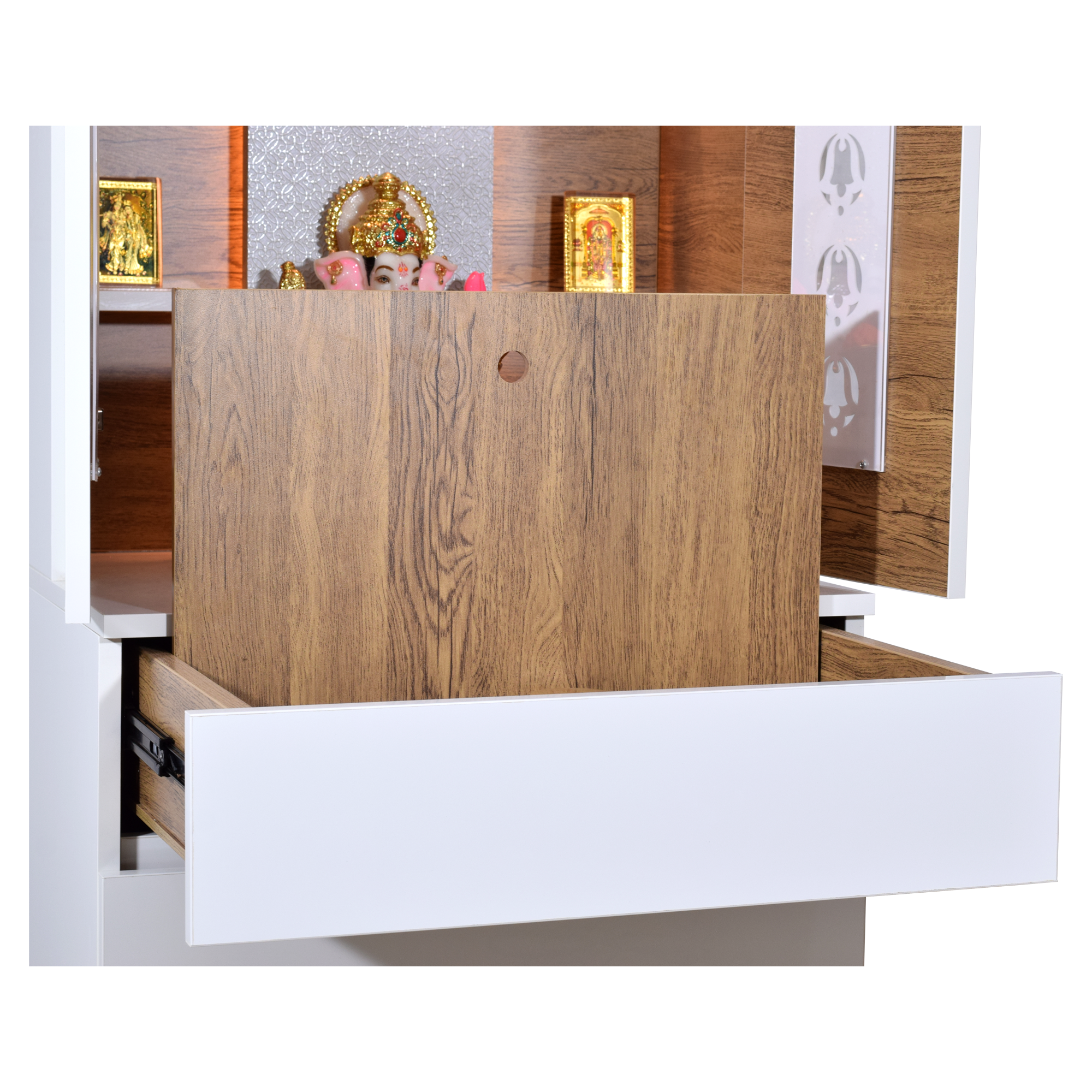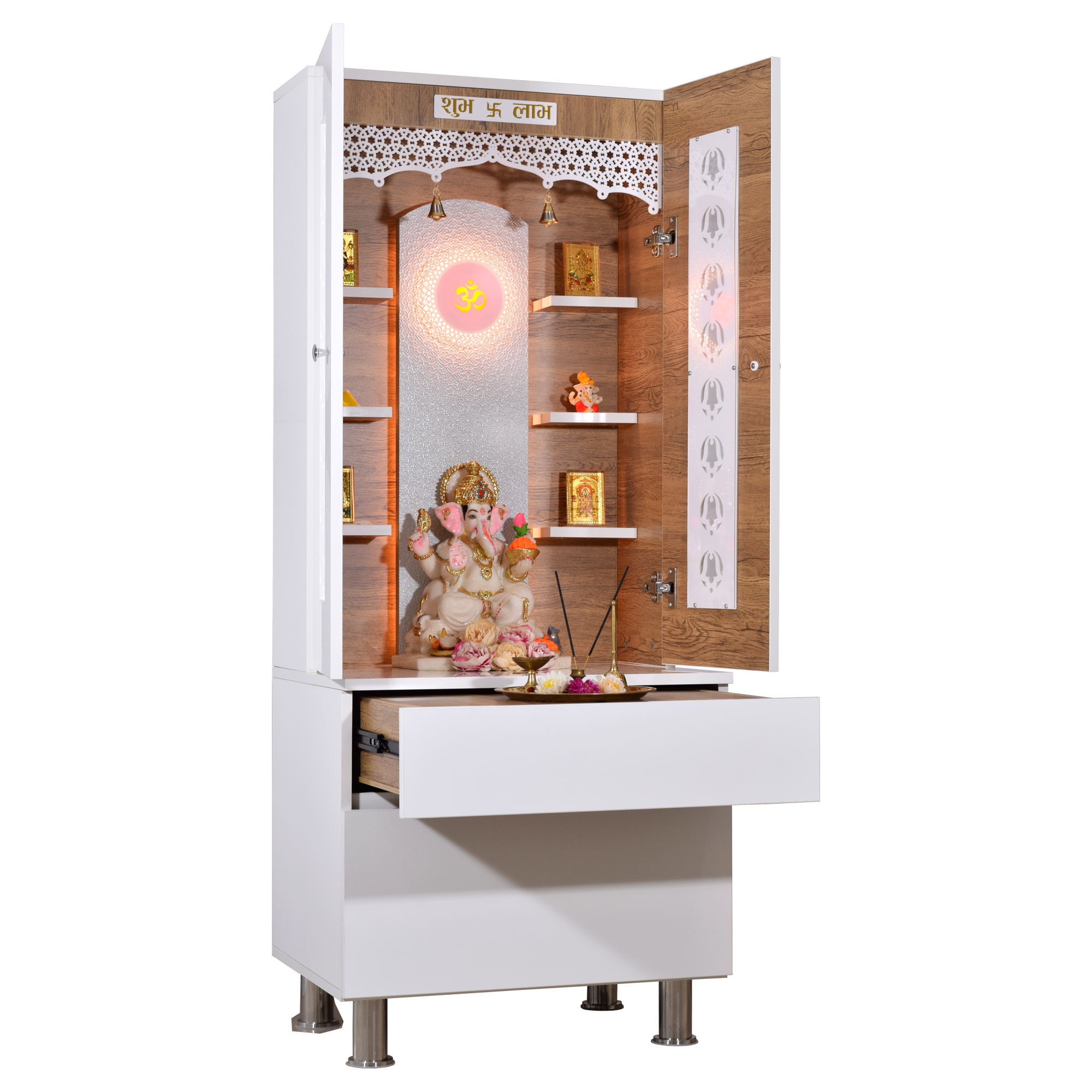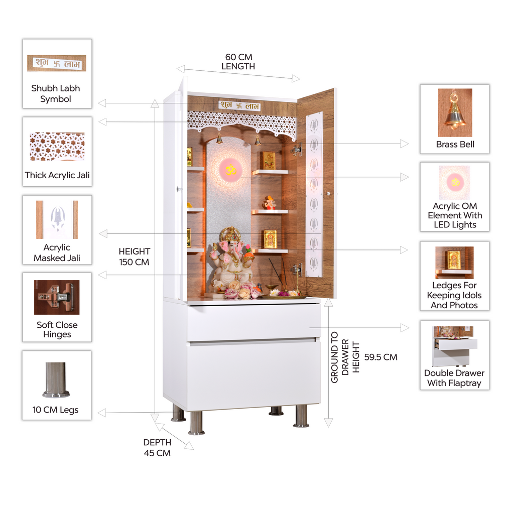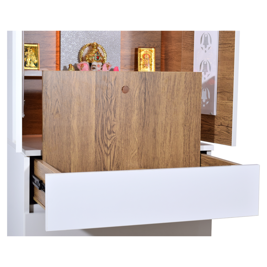 • Ample storage space - The sleek design includes a drawer with detachable platform extension tray for thali sets, incense, diyas, and other pooja essentials